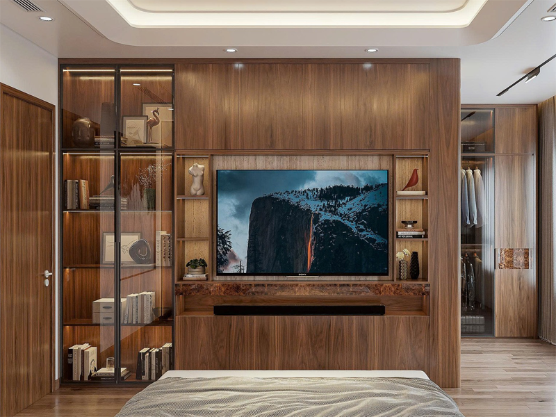 Hệ kệ tivi được bố trí khoa học, đảm bảo sự tiện nghi khi sử dụng, đồng thời tích hợp tủ rượu trưng bày với các ngăn mở và kính trang trí, tạo điểm nhấn nổi bật. Ánh sáng LED âm tủ nhẹ nhàng làm nổi bật từng chi tiết, mang đến cảm giác cao cấp và hiện đại.